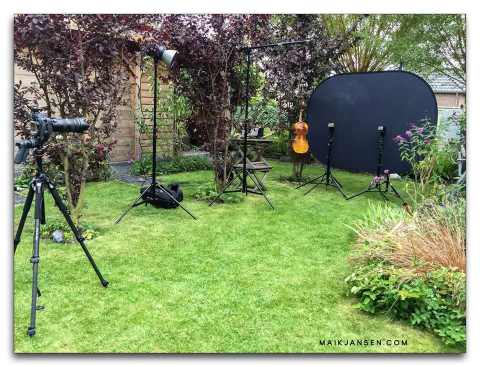 Setup van links naar rechts: tripod met D810 voorzien van de 70-200 mm op manual focus, bekabelde afstandbediening en skyport trigger voor de studioflitser. Deze staat met een standaard reflector met grid op de tweede standaard. Vervolgens een boomstand waaraan de viool hangt aan een vislijn. Daarachter staan twee reportageflitsers in slave mode (ze zien de flits van de Elinchrom en flitsen dan mee). Deze verlichten de rook van achteren. Op de twee tuintafeltjes staat de rookmachine die de rook voor de opvouwbare achtergrond blaast. Deze hangt in twee standaarden die erachter staan. De opnamen zijn gemaakt bij 1/200 sec @ f/18, ISO 100 om het omgevingslicht weg te drukken.